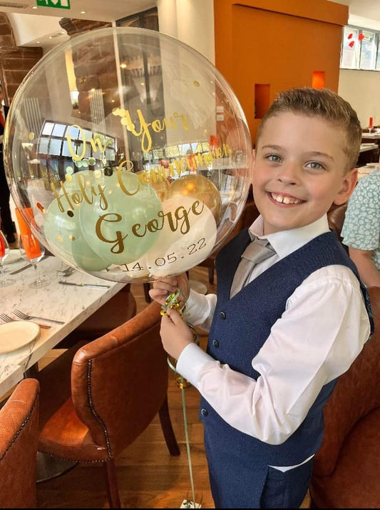 Beautiful personalised bubble balloons are an ideal gift for any occasion such as christenings, birthdays, communions or centre piece for a party.